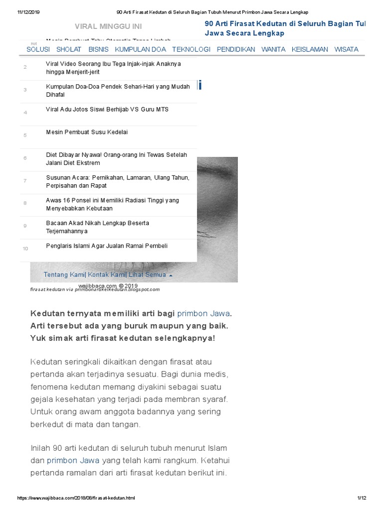 Apakah kamu pernah merasakan kedutan di tubuhmu? Kedutan adalah kondisi di mana otot berkontraksi secara tidak terkendali. Banyak orang percaya bahwa kedutan di tubuh memiliki arti tertentu. Berikut adalah 90 arti kedutan lengkap di seluruh tubuh.